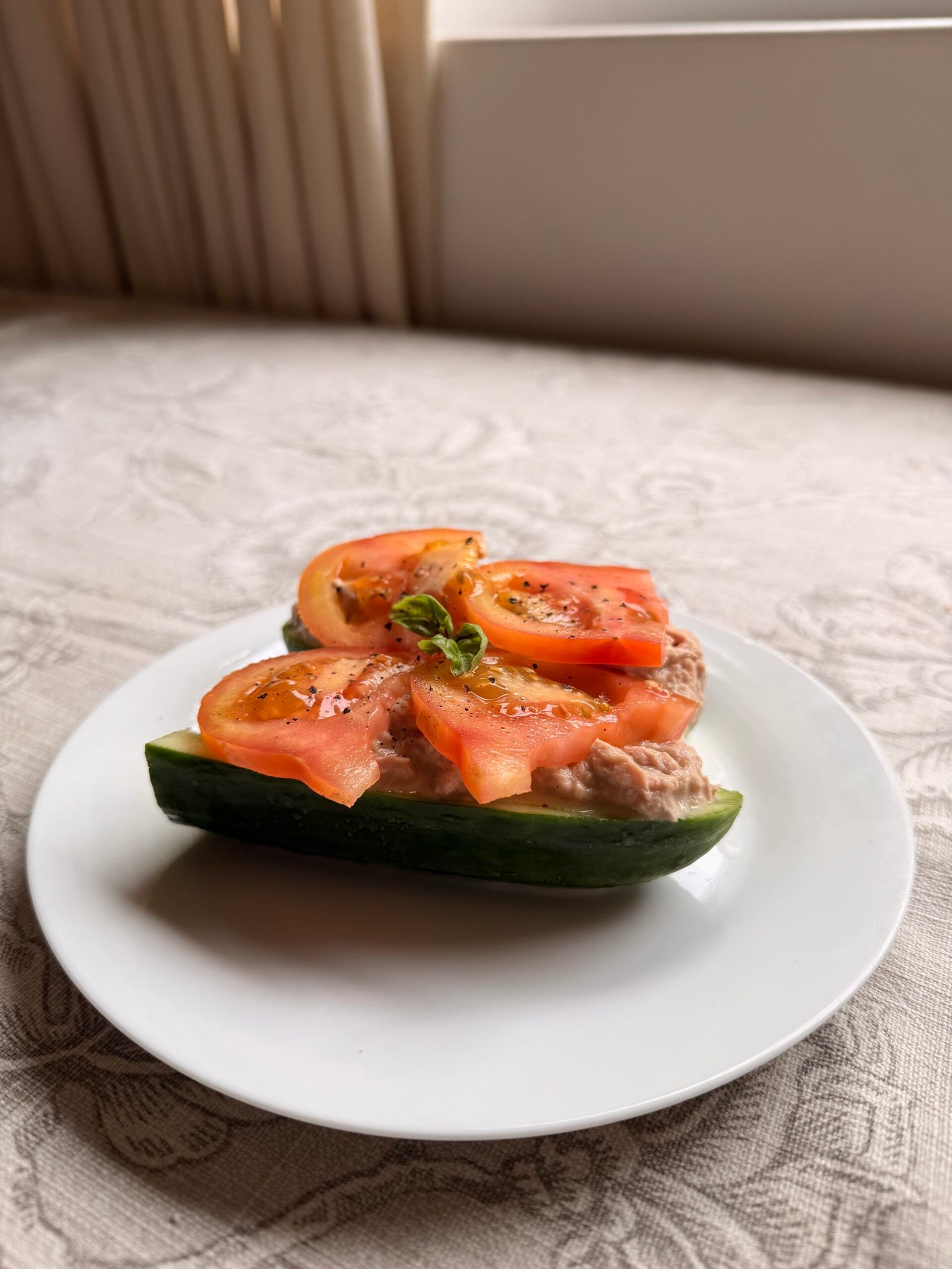 • Spoon the tuna into the cucumber halves and top with tomato slices.