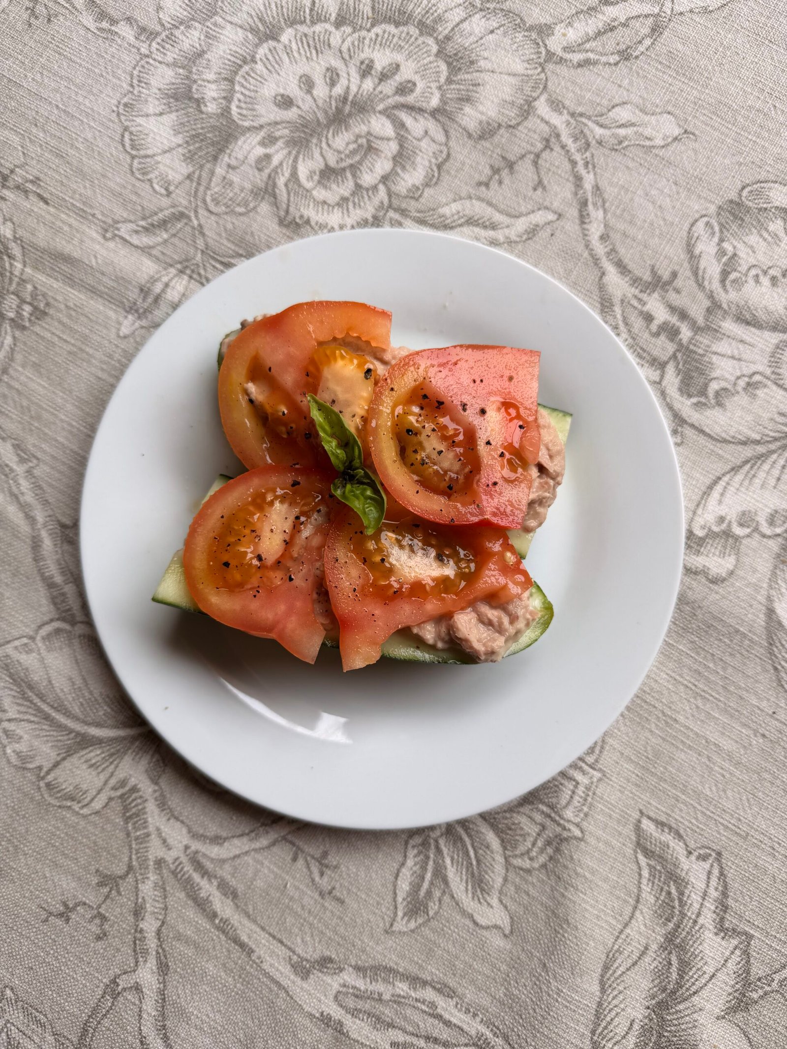 • Spoon the tuna into the cucumber halves and top with tomato slices.