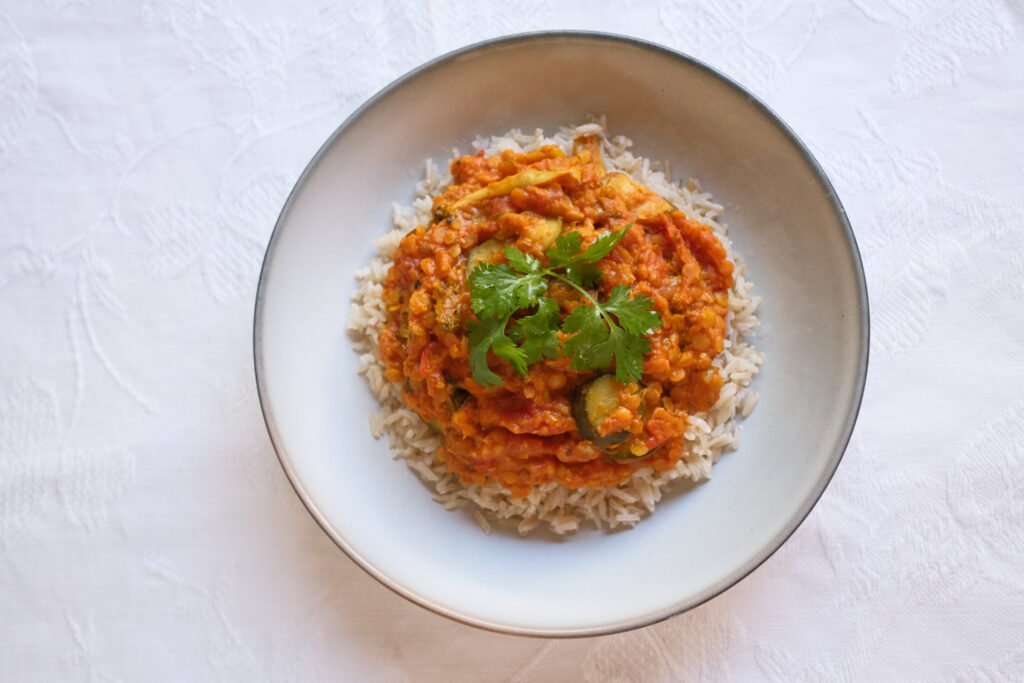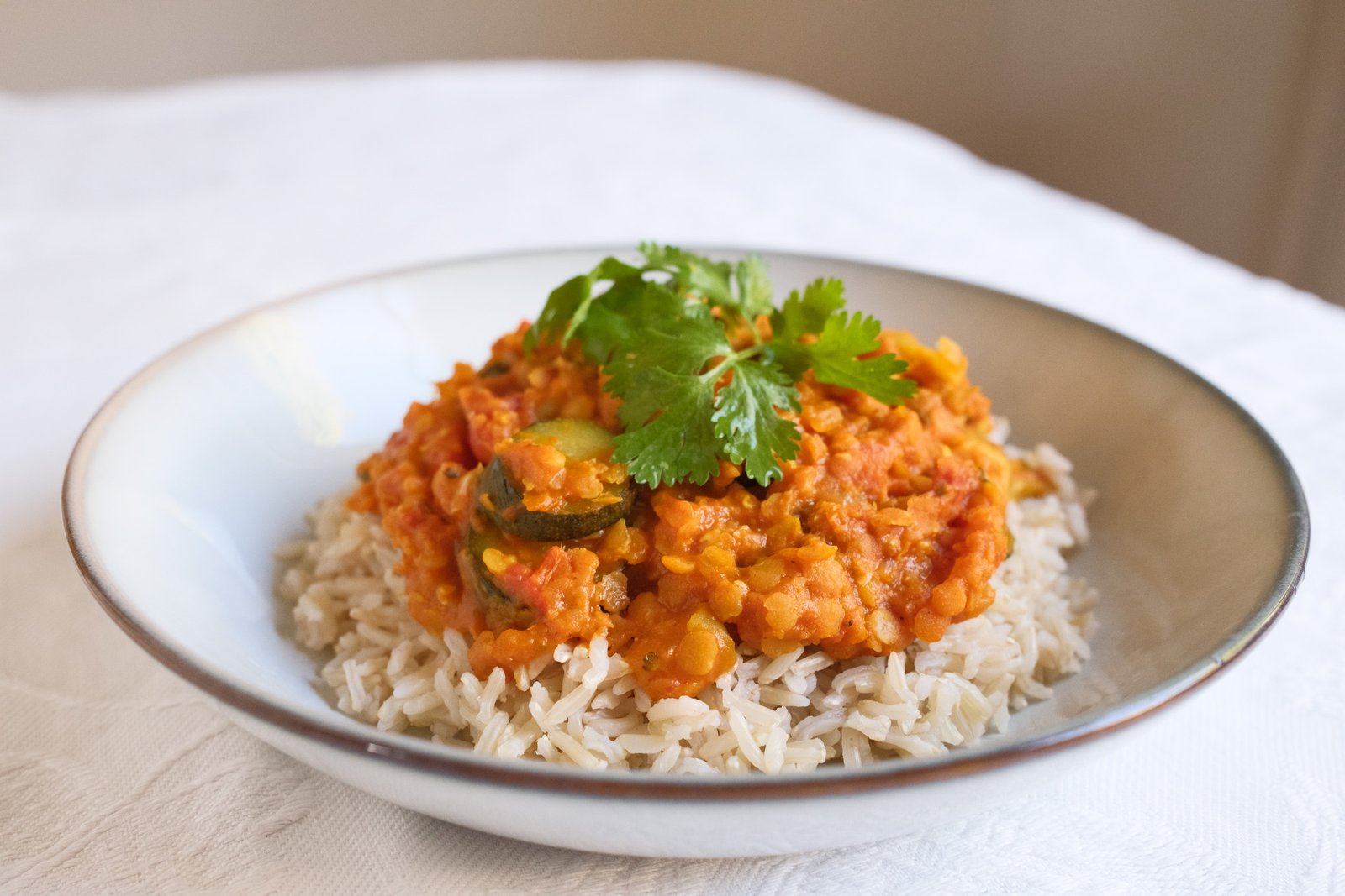 • Add salt and pepper to taste, drain and rinse the brown rice and enjoy your lentil dahl with a bit of coriander garnish on top!