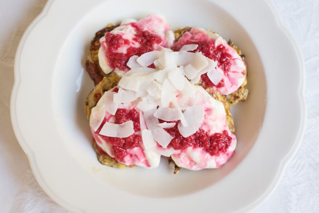 • Cook until lightly golden/brown on both sides and serve with any of your favourite toppings. In the above picture I have added yoghurt, some cooked raspberries, a drizzle of honey and some coconut flakes.